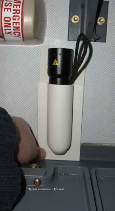The modification includes the design of a custom torch holder and approves the installation of LED flashlight under the cockpit window and under the FWD flight attendant seat.