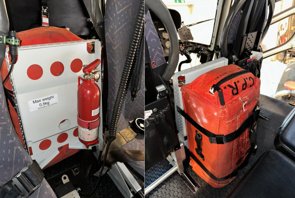 TSO approved Switlik or Aerazur life rafts can be mounted in our new life raft holder between the pilot seats in the Airbus ECAS350B3 / EC125 helicopter. It ensures a safe and appropriately secured installation which is easy to access and deploy if ever needed, by the use of 2 dedicated securing belts. In the front of the holder there is a practical compartment for documents, iPads etc. A fire extinguisher can be mounted on the front to free up space on the floor. The light weight life raft holder can be easily removed if operationally no longer required.