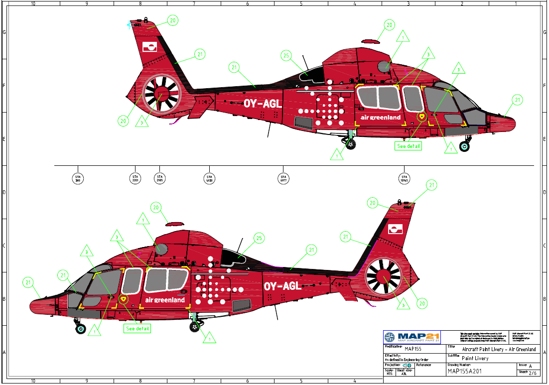 Air Greenland’s fleet of six EC155B1 helicopters needed a new paint scheme to match current fleet livery design. The new livery is fully in compliance with CS-29 and is purpose-made to ensure ease of maintenance, e.g. white painted wheel wells to help discovery of cracks, black tailboom fairings to minimise visible exhaust residues and anti-slip surfaces etc.
