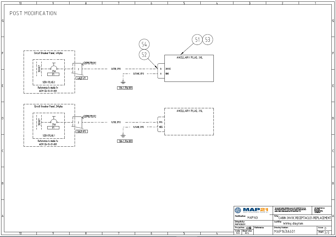The operator has a need to change one of the two factory-installed 28VDC servicing connectors (receptacles) in the cabin. The new receptacle (MS3450L16-11S) is selected according to the intended application, to ensure fleet commonality.